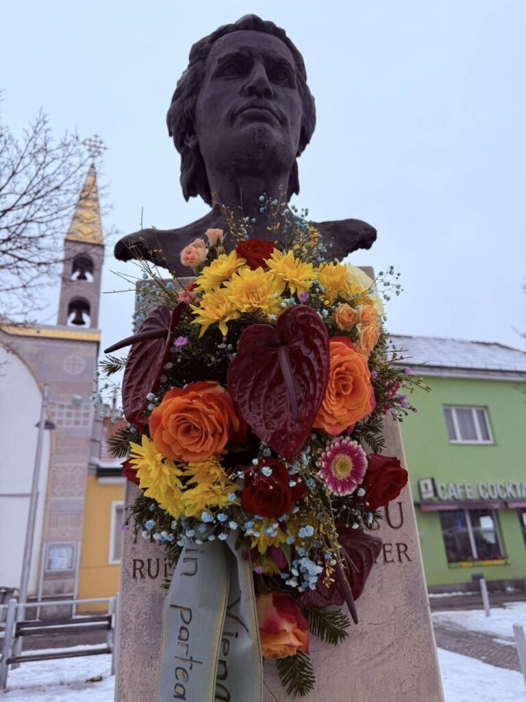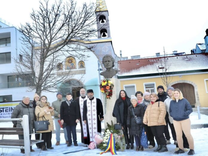 La Viena, departe de țară, dar aproape de sufletul românesc, bustul lui Mihai Eminescu, amplasat în fața Bisericii Ortodoxe Române de pe Simmeringer Hauptstrasse, a fost acoperit de flori, într-un gest de profund respect și recunoștință. Florile au vorbit, în tăcerea lor, despre dor, memorie și continuitate.